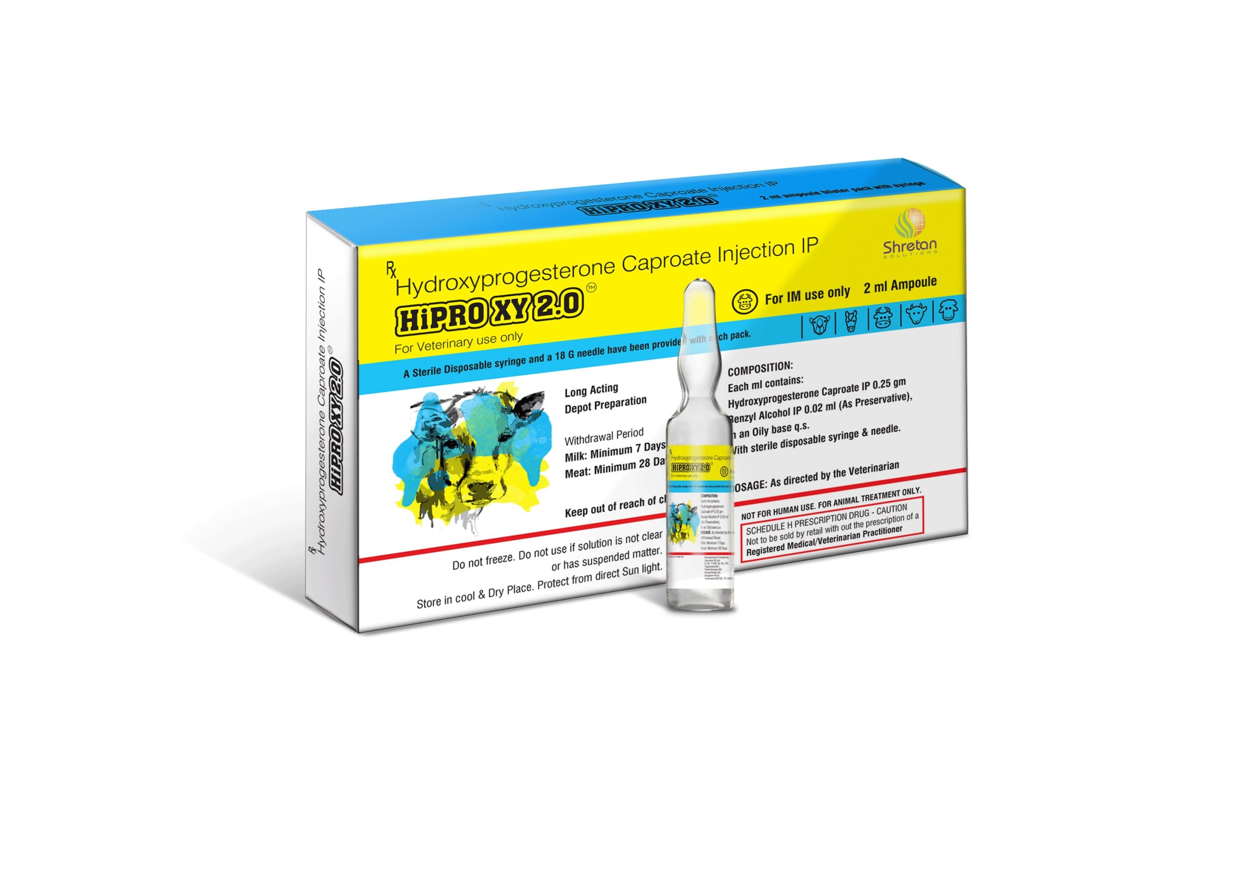 HiPRO XY 2.0 is a long-acting depot preparation designed for veterinary use. Each pack includes a sterile disposable syringe and an 18G needle for easy and precise administration. Formulated with Hydroxyprogesterone Caproate, it ensures controlled and sustained hormone release, supporting reproductive health in animals.